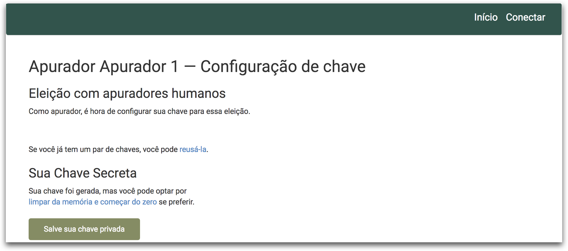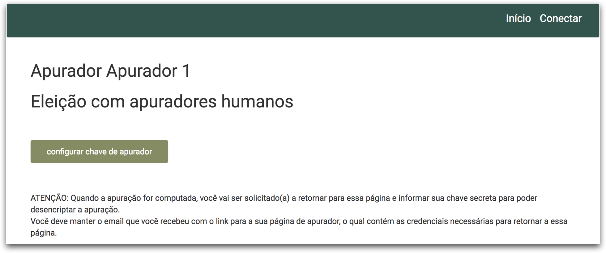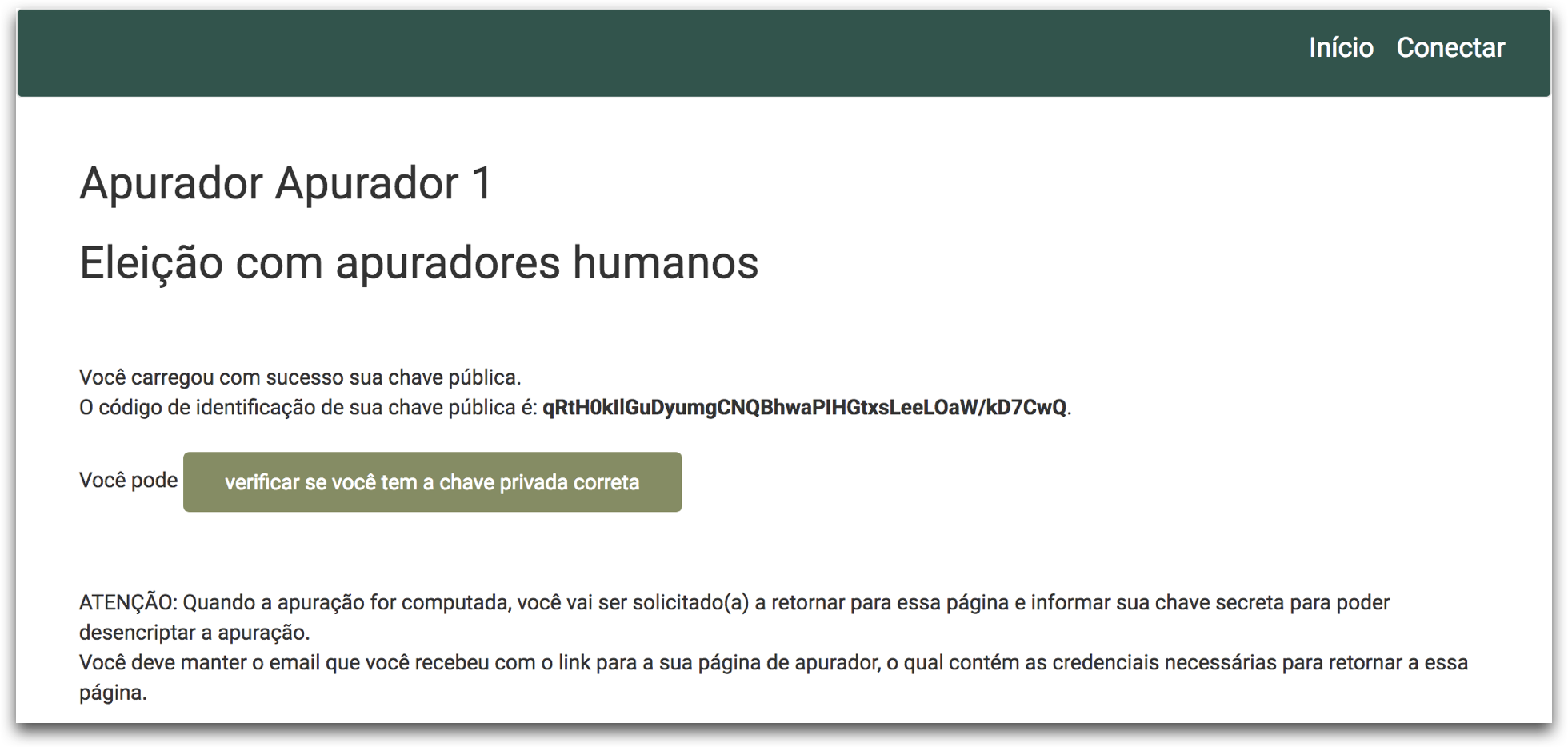 Ao ser designada como um Apurador, a pessoa receberá um e mail do Sistema de Votação Helios com as instrução e um link para que essa possa gerar ou carregar sua chave privada. A pessoa deve obrigatoriamente entrar no link que está no e-mail para que possa carregar suas informações de apurador.